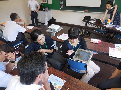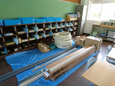 室内機の設置工事の機材が教室に