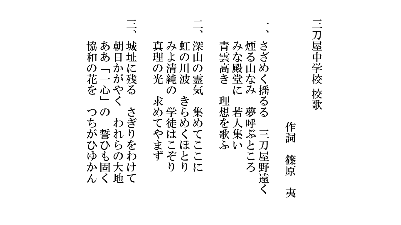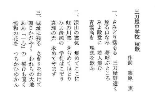 | 昭和33年 9月30日 | 町立三刀屋中学校、同鍋山中学校、同雲見中学校の三校を 統合して町立三刀屋中学校を設置開校 |