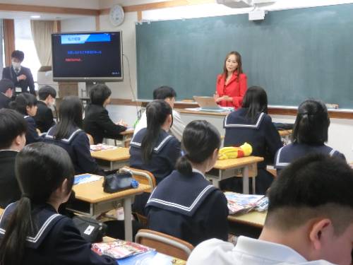 9日(火)、岡山県から岡三食品代表取締役 田所雅江様 にお越しいただき、3年生を対象にアントレプレナーシップの授業を行っていただきました。失敗を恐れず挑戦することの大切さや失敗も含めてやってみることが経験値として積み上げられていくことを自らの体験を交えて、お話しいただきました。生徒の振り返りからは、自身の生き方を深く見つめる機会になったことがうかがえました。