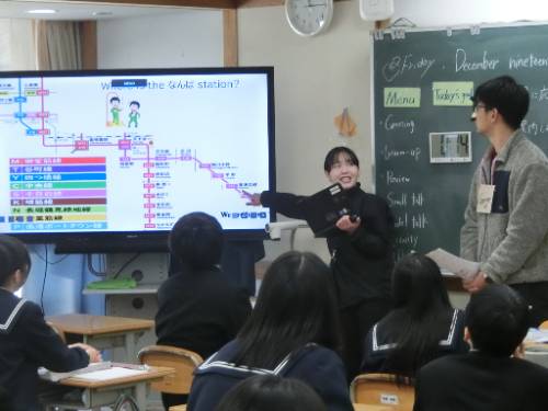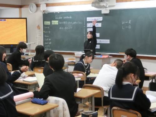 2年生英語 2025年12月19日 19日(金)、2年生で英語の研究授業を実施しました。既習の知識や技能を活用し、乗り物を利用して『ある場所』への行き方を尋ねたり答えたりすることをねらいとした学習でした。生徒たちは、ペアで楽しそうに対話しながら、学習に向かっていました。