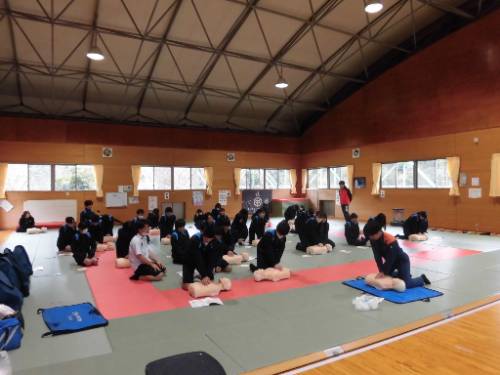 20日(火)2・3時間目、2年生の保健体育の時間に救急法講習会を実施しました。雲南消防署から2名の署員さんにいらしていただき、心肺蘇生のための心臓マッサージや人工呼吸法を、人形を使って実践しながら、教えていただきました。その後、AEDの使用方法やケガへの対応(止血・固定など)方法なども教えていただき、生徒たちは「いざ」という時に備え、大変有意義な学びができました。