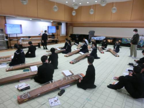 箏教室(音楽科) 2026年01月27日 27日(火)から30日(金)まで、音楽の時間には島根県三極連盟の勝部先生にお越しいただき、和楽器(箏)の学習を行います。初日の今日は1年1組の授業でしたが、みんな真剣な表情で話を聞き、少し緊張しながら箏の演奏に挑戦していました。