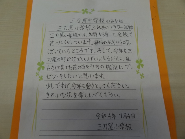 いただいた花の苗を大切に育てたいと思います。三刀屋小学校の皆さん、ありがとうございました。
