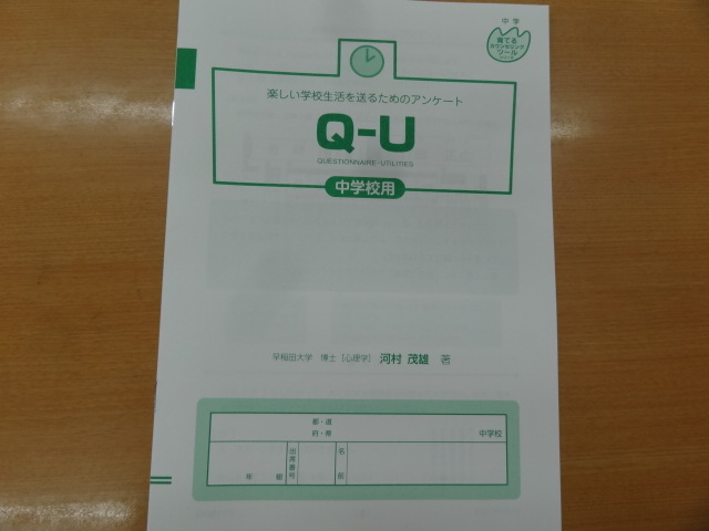今日14日(火)は、アンケートQUを行いました。アンケートQUは、学校生活における個々の満足感や意欲、学級集団の状態などを質問用紙によって測定できるものです。その結果を学級経営や一人ひとりの生徒の状況の把握、いじめ防止などに生かすことができます。年2回行うことで、学校が行う具体的な手立ての成果を確認したり、様々な問題の予防や早期発見に役立てていきます。