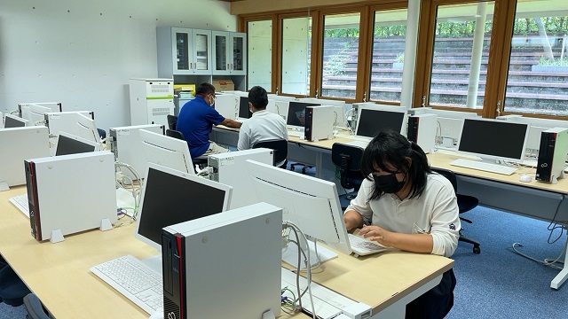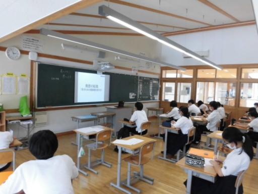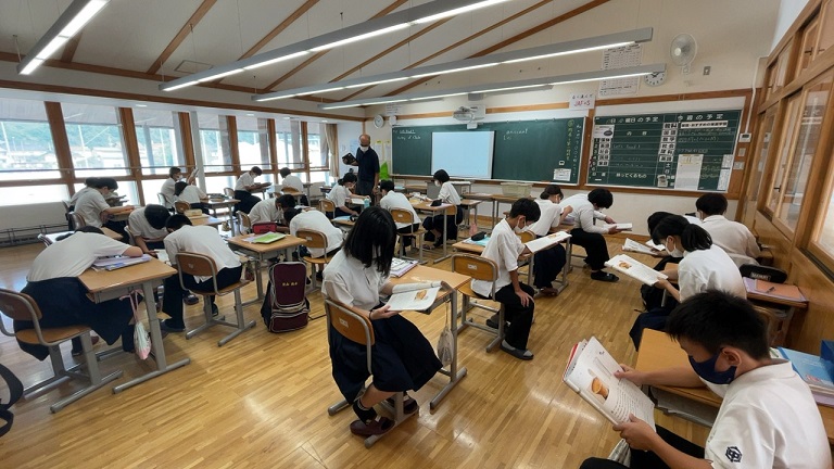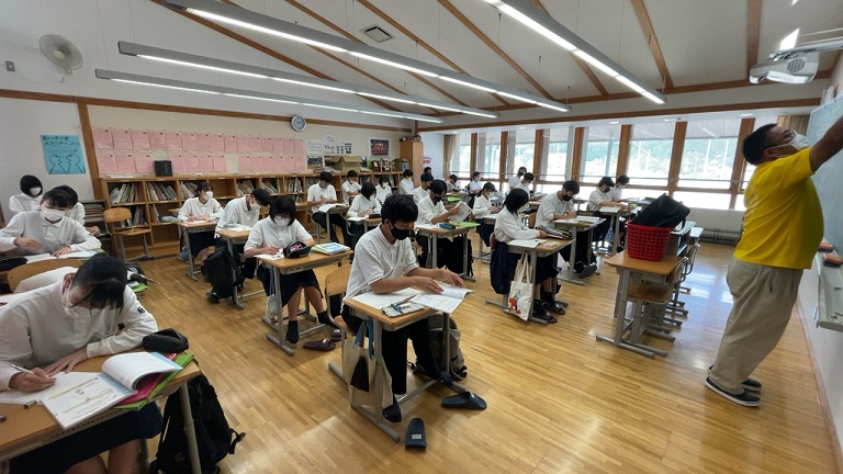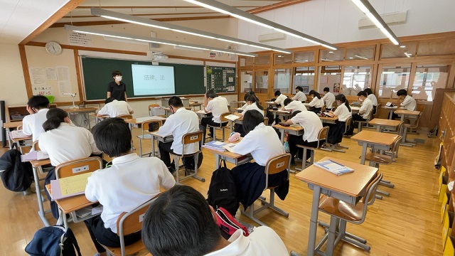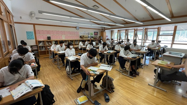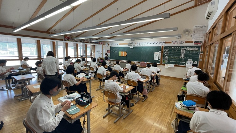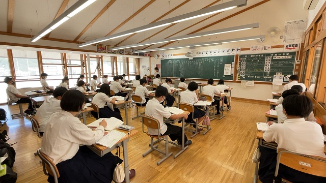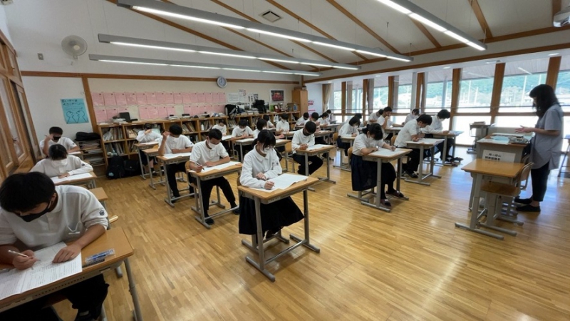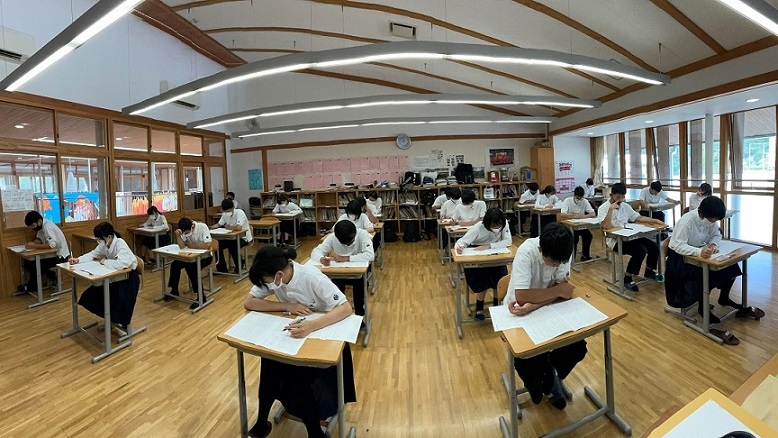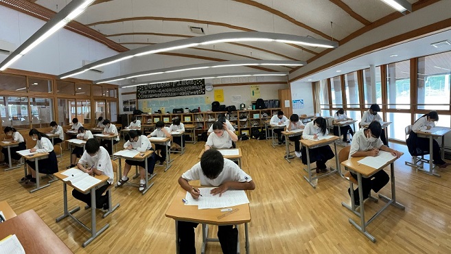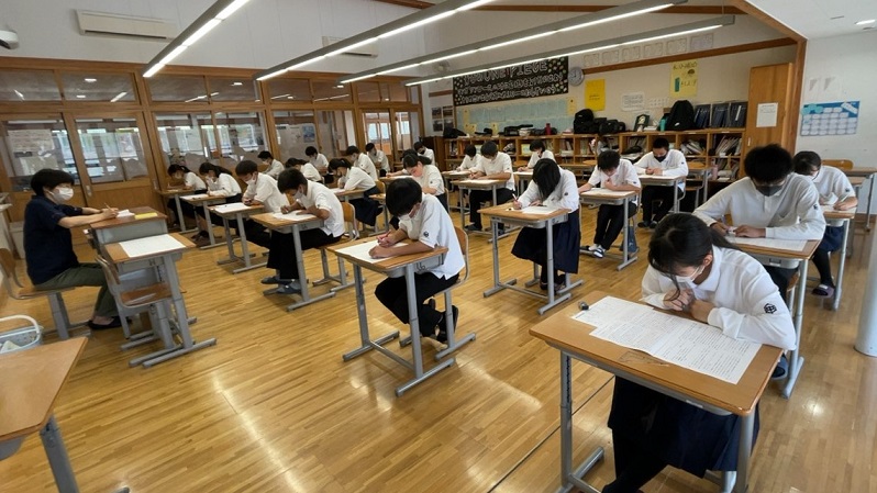 写真は、各学級のテスト中の様子です。真剣に問題に向かっています。