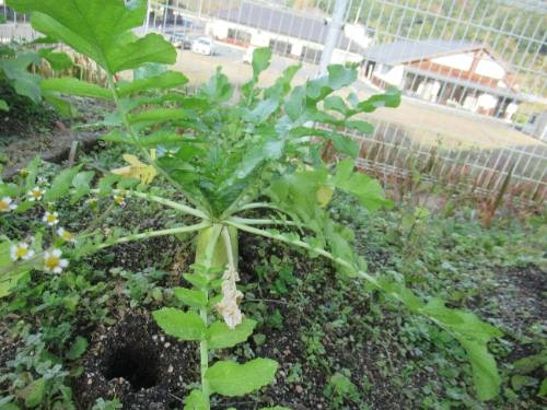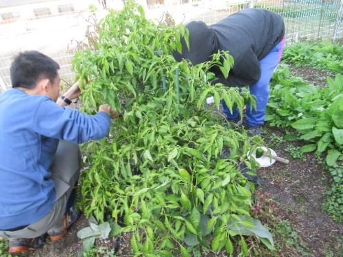 12/1 1時間目にピーマンの収穫と春どり大根の種まきをしました。ピーマンは、暑い夏を乗り越え、いまだに実をつけてくれます。大きさは小ぶりですが、今日もたくさん収穫することができました。