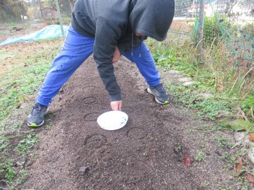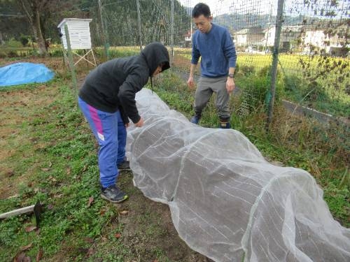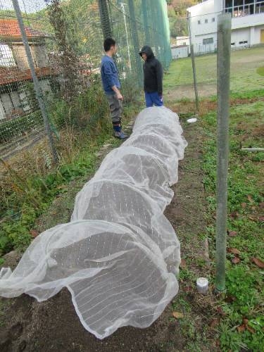 大根は、寒い冬を乗り越えて春に収穫する大根の種まきをしました。深さ2~3cmほどに点まきをして、土をかけました。その後、防寒・防風対策のためのトンネルも設置しました。甘味が強く、テリがあり、食味に優れた春大根の収穫は、来春になりそうです。
