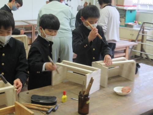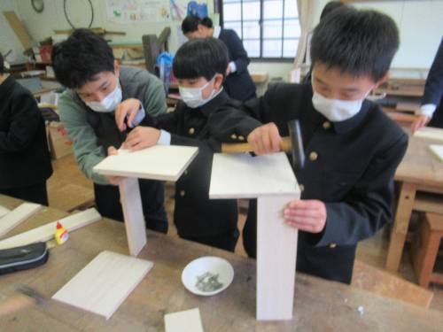 昨年も経験した6年生は、あっという間に材料を加工し、くぎを打ちつけることができました。来週、ヤスリで磨き、ニスを塗って完成させる予定です。