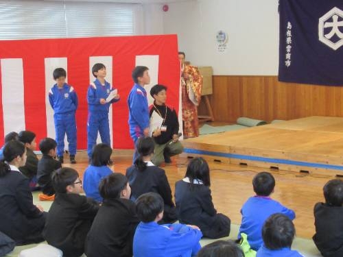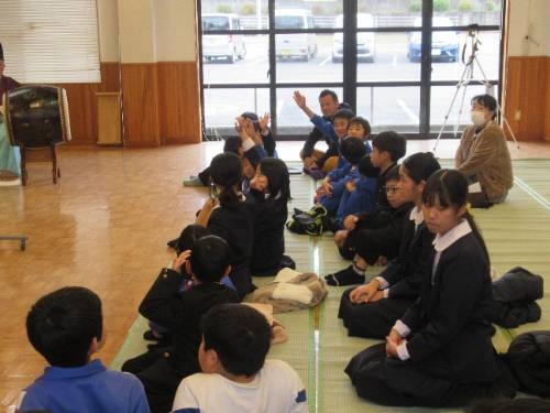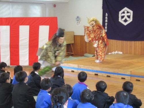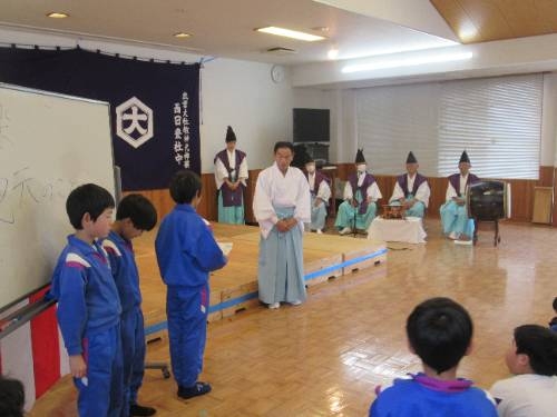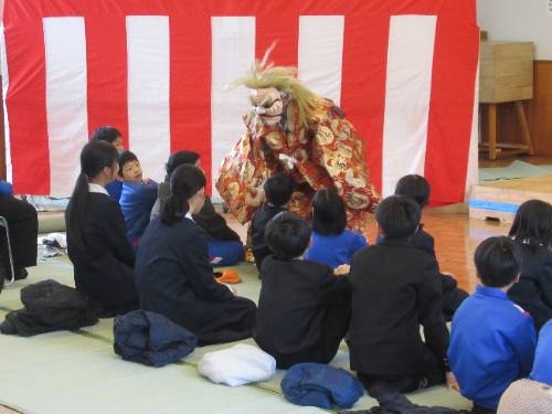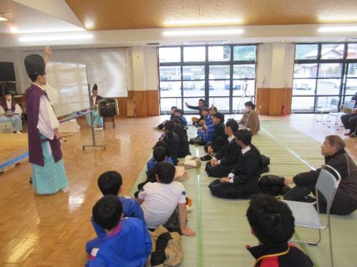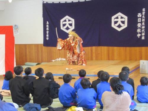 12/12 西日登交流センターを会場に、西日登神楽の鑑賞会を行いました。江戸時代から脈々と引き継がれ、地区全体で大切にされてきた神楽を目の当たりにした子どもたちは、その圧倒的なパワーに圧倒され、食い入るように鑑賞していました。鑑賞の後、プチ講座があり、「お祈り」「楽しむため」「地域を盛り上げるため」に神楽が行われていることを教えてもらいました。また、神楽をやっていると、「地元のことがどんどん好きになる」そんないいところがあることも教えてもらいました。