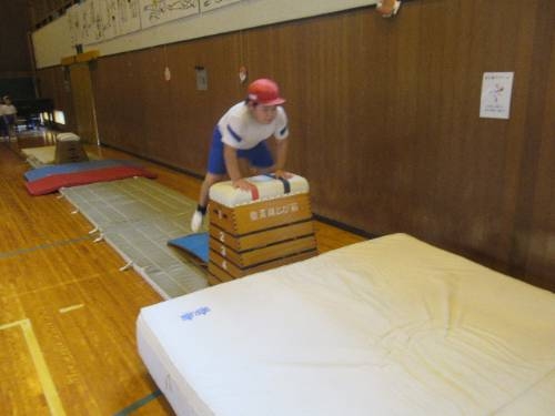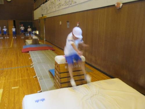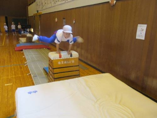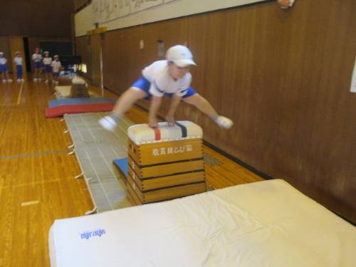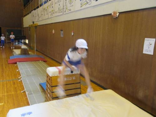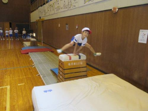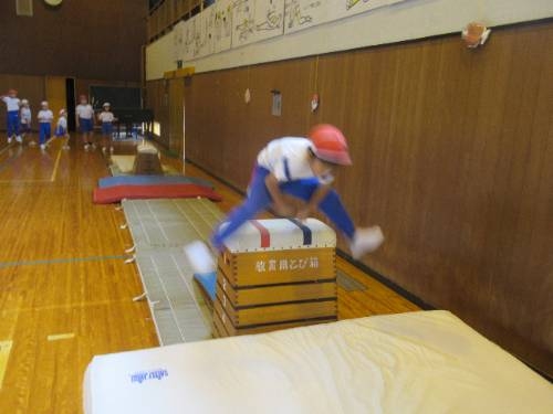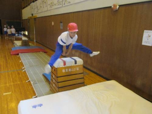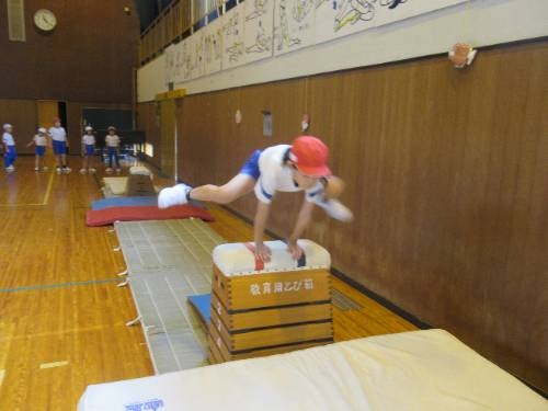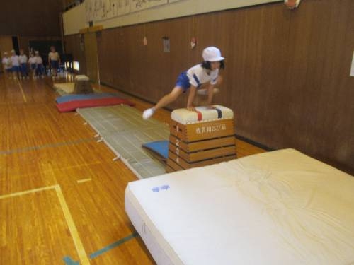 全員跳べました! 10/21 1,2年生が体育の時間に跳び箱にチャレンジしました。踏切りの助走や着手、突き放しのタイミングなどをしっかりと練習してきた子どもたちが、6段の高さを全員クリアしました。初めの頃は、怖くてなかなか身体が持ち上がらなかった子どもたちもたくさんいましたが、「跳びたい!」という気持ちを持ち続け、みんなで励まし合いながら頑張ってきました。本当に頑張りました。この後、跳び箱の向きを横から縦に変えて挑戦しました。