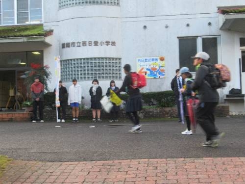 木次っ子あいさつウィークでした 木次っ子あいさつウィークでした。木次中の先輩方が、寒い中、昇降口前で、子どもたちを出迎えてくれました。久しぶりに先輩と対面した子どもたちは、少し気恥ずかしそうでしたが、しっかりと挨拶をして昇降口に向かいました。木次中学校のみなさん寒い中、本当にありがとうございました。