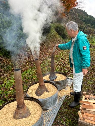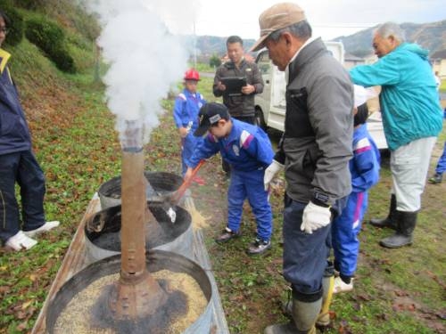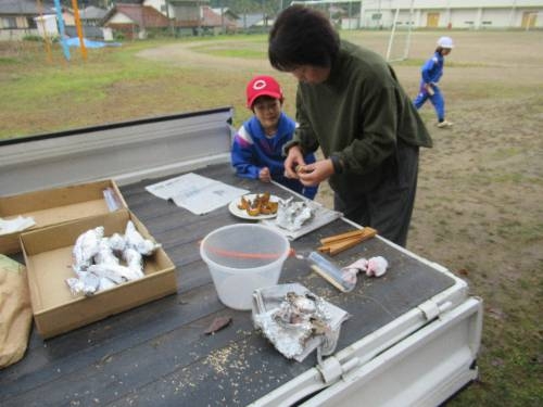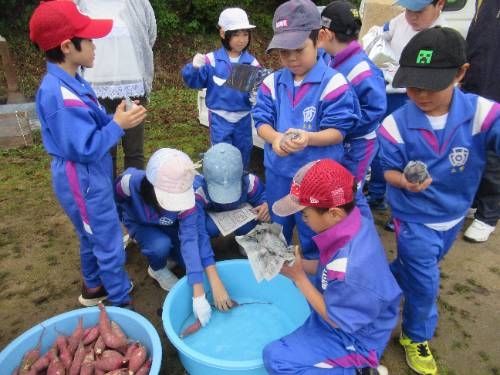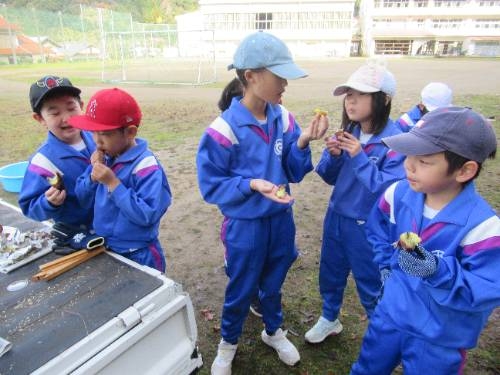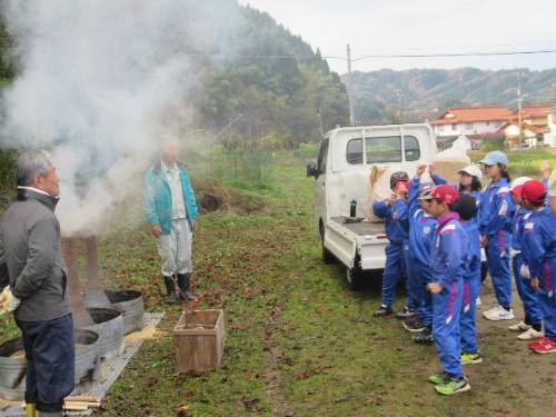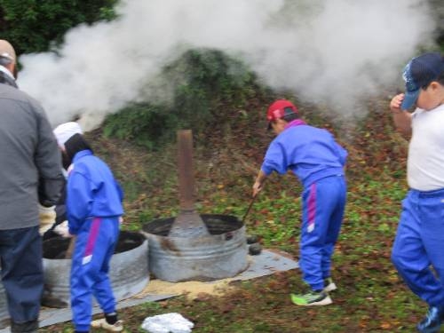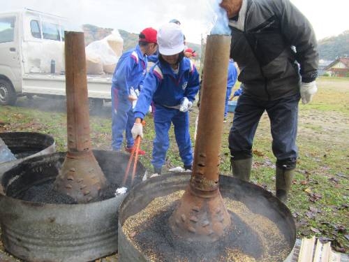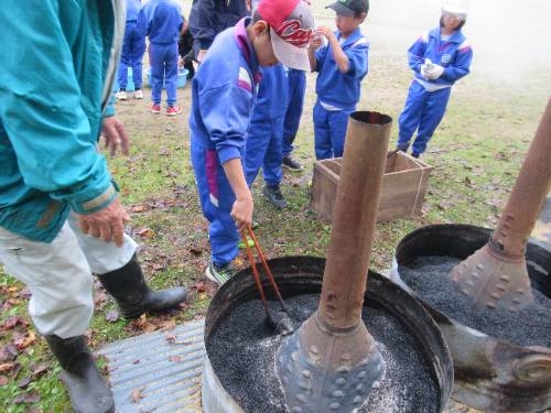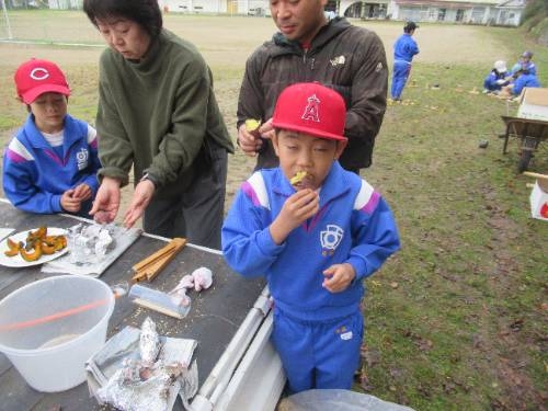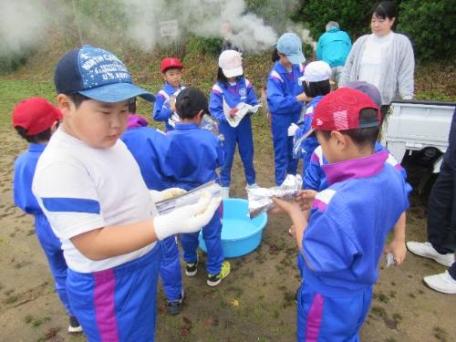 焼いも美味しかったです! 11/25 5月に苗植えをして、10月に収穫したサツマイモを焼いもにしました。地域の方にご指導いただきながら、新聞紙やラップに包んだサツマイモを燻炭の中に投入しました。燻炭から出る煙に苦戦しながらも無事作業を終えると約1時間ほど待って、焼いもを取り出しました。 出来上がった焼いもは、ホカホカで、甘くて、とても美味しいかったです。