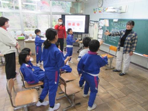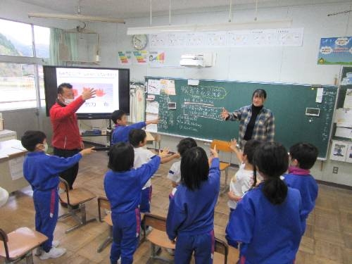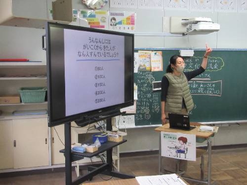 初めにダイバーシティ雲南の方から世界の国々や雲南市の様子を教えていただきました。雲南市には、現在、19か国270人もの外国の方が住んでおられるそうです。その人数に子どもたちもビックリしていました。