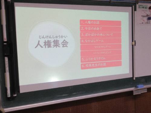 12/5 3時間目に人権集会を開きました。毎年12月4日から12月10日を人権週間とし、自分も友だちも一人ひとりが違うことを知り、それぞれの違いを大切にすることを考える期間です。みんなが自分らしく生きる権利=人権について考える大切な機会とし、西日登小でも毎年人権集会を開催しています。