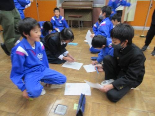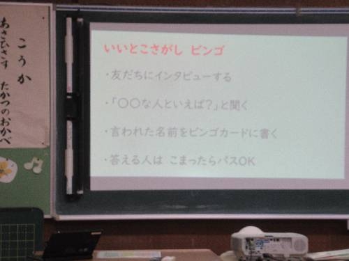 お互いの良さを見つけながら交流し楽しい時間となるよう なかよしゲームを通して、交流を深めることができました。仲間さがしゲームやいいとこさがしビンゴで会場は盛り上がりました。これでまた日本一しあわせな学校に一歩近づきました。