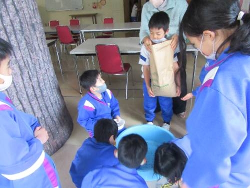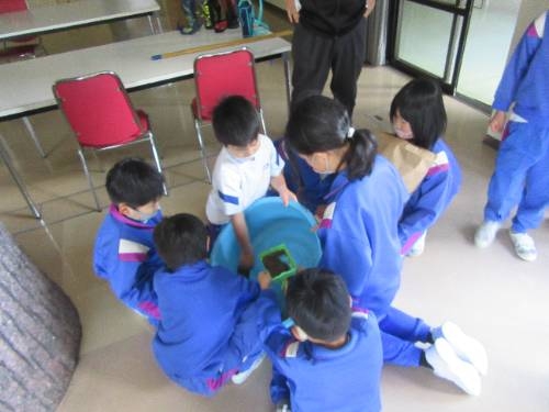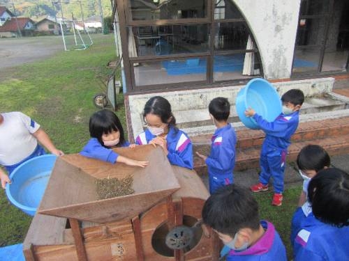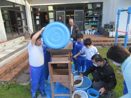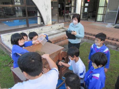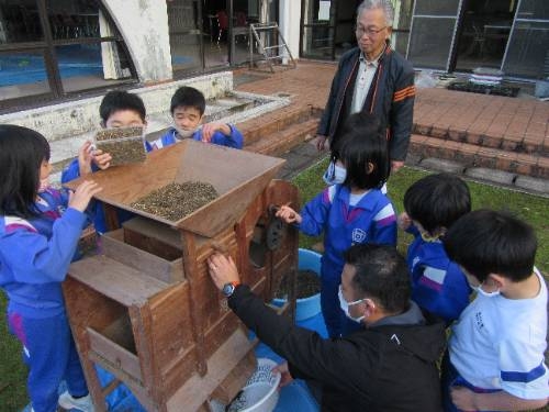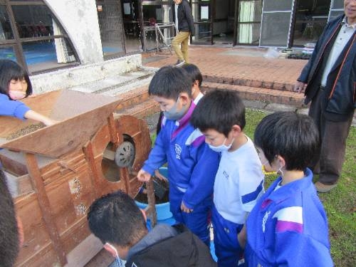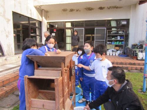 そばの実の選別作業 12/9 1,2年生がそばの実の選別作業を行いました。先月収穫したそばの実を昔から使われている「唐箕」という選別機にかけて、風の力を利用して、そばの実ともみ殻を選別しました。ハンドルを勢いよく回すと、重いそばの実と軽いもみ殻が分けられ、それぞれ排出口から飛び出してくる様子に子どもたちはビックリ。昔から使われているものですが、その機械の仕組みにも興味津々でした。