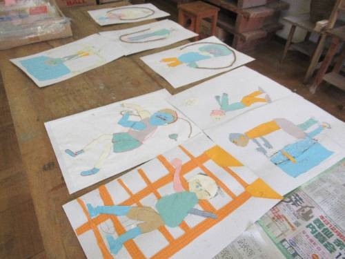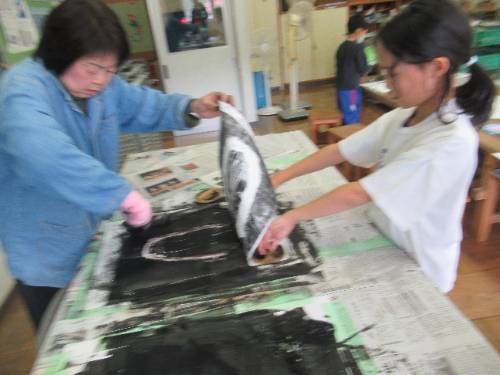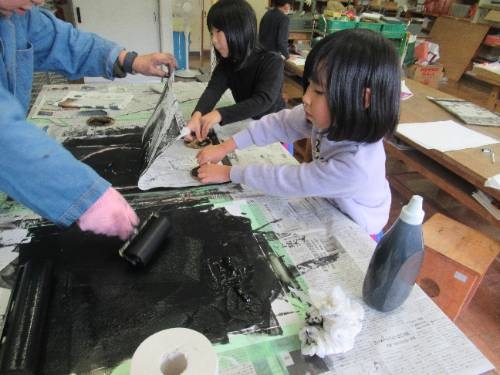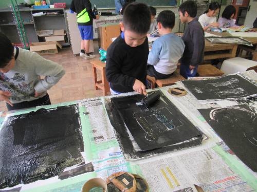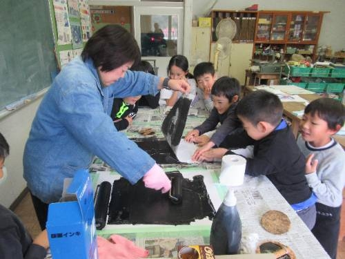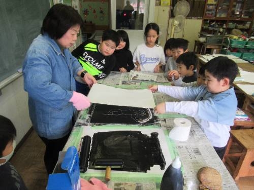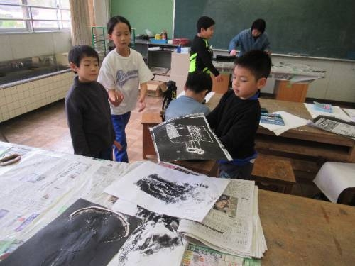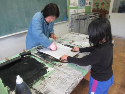 版画が少しずつ完成しています 12/16 1,2年生が紙版画の刷りに挑戦しています。まず、インクをしっかりと伸ばし、バレンを使って丁寧に写し取る方法を先生に教えてもらいました。はじめは、先生と一緒に作品を刷ってみて、その後、自分の力で挑戦してみました。なかなか上手くいかない様子でしたが、どの作品も子どもたちの思いが伝わる素敵なものでした。