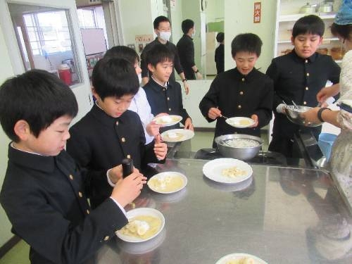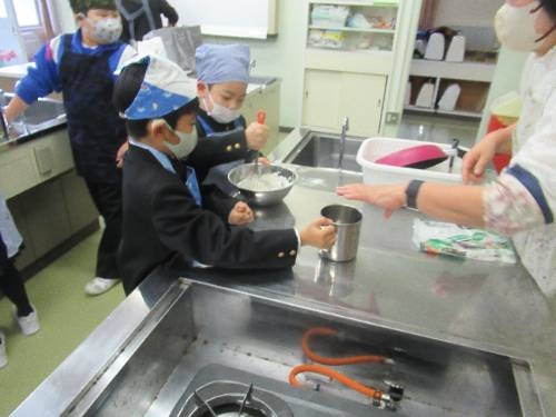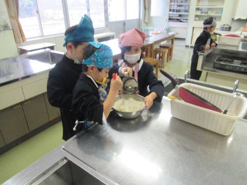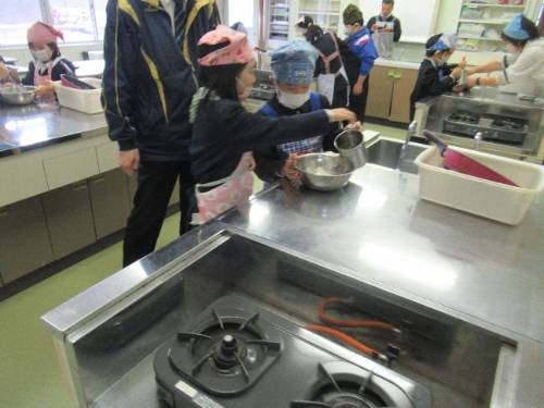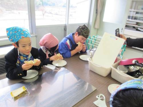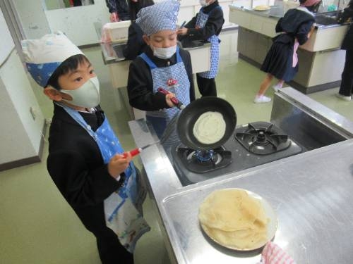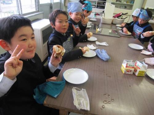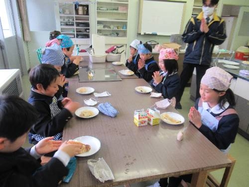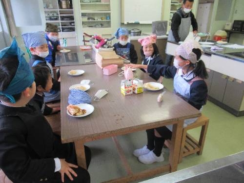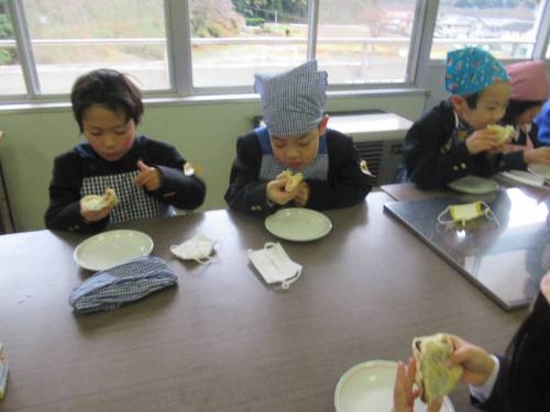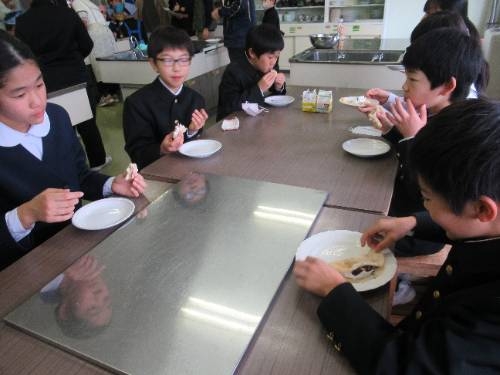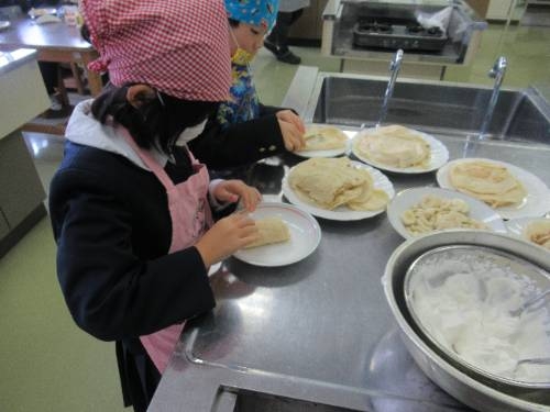 1,2年生は、全員そろってお楽しみ会を開きました。家庭科室でクレープづくりをして、おいしくいただきました。たくさん作ったクレープを上級生や先生方に振舞ってくれました。とても美味しかったです!