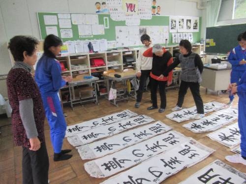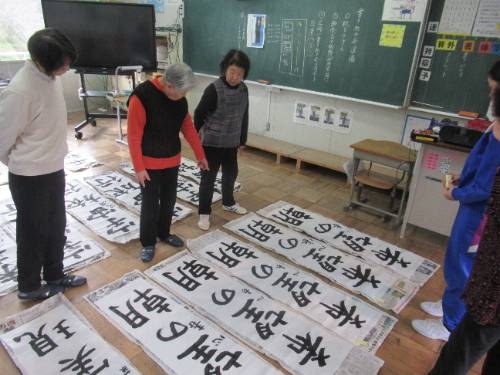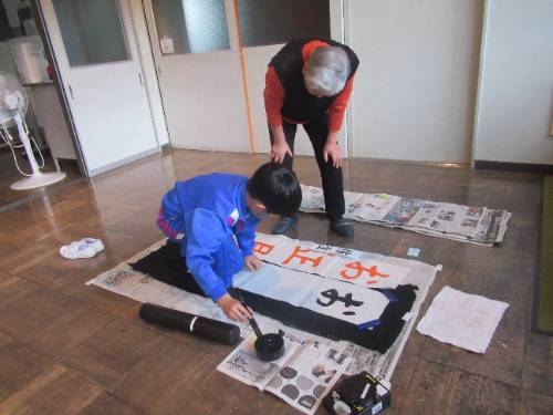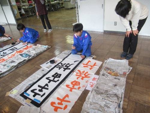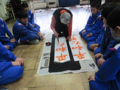 書初め会! 1/13(水)書初め会が行われました。4名の講師の先生方にアドバイスを受けながら、子どもたちは、一筆一筆心を込めて作品を仕上げていきました。3年生は初めての書初めでしたが、思い切りよく力強い字を書くことができました。