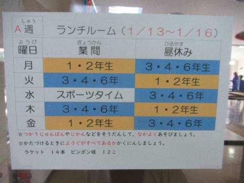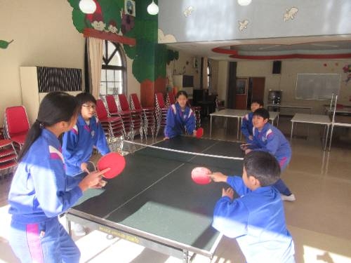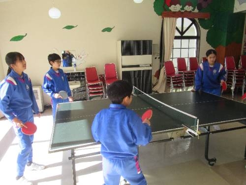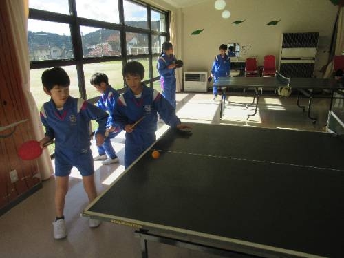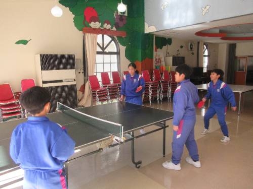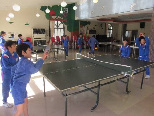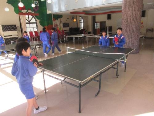 冬期の遊び方がひとつ増えました! 3学期に入って、ランチルームに卓球台が設置されました。ランチルームの校庭側に卓球台を2台設置し、寒さの厳しい時にも身体を動かすことのできるスペースを確保しました。今週から利用できるようになり、いつも体育館で遊んでいる子どもたちもランチルームに集合しました。