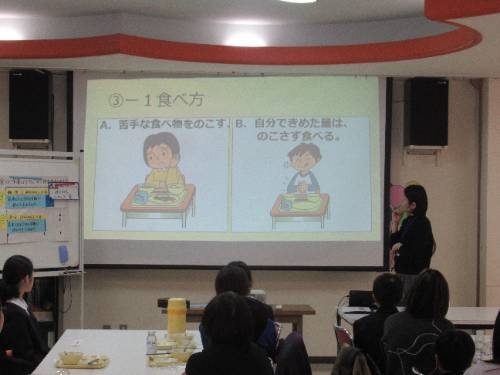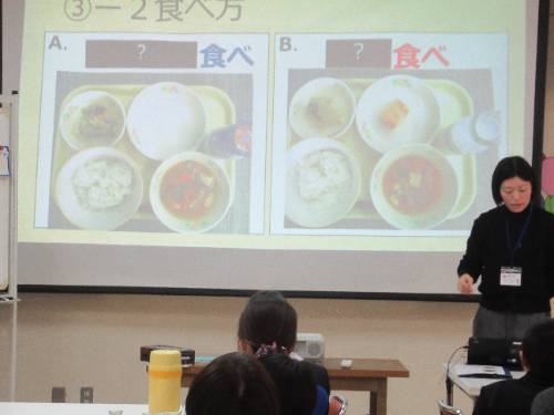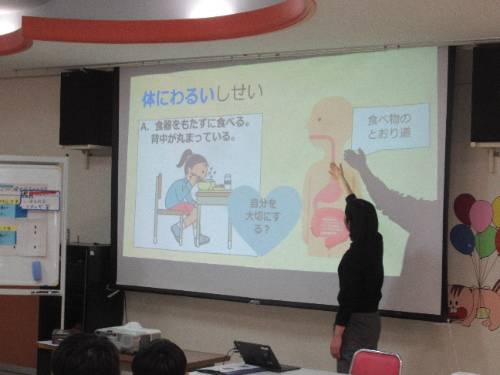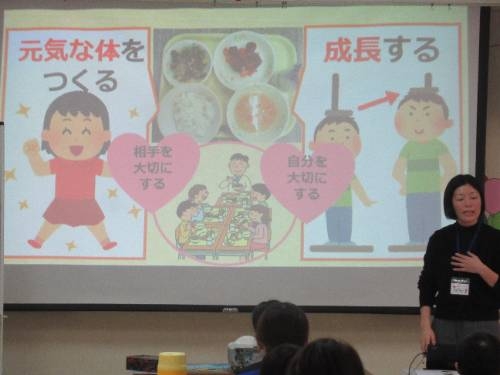 給食後は、中央給食センターの方を講師に、日常の食生活について、いっしょに考える機会を設けてもらいました。元気なからだをつくり、大きく成長するために大切なことをしっかりと教えてもらいました。