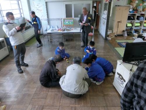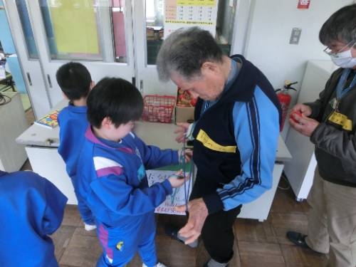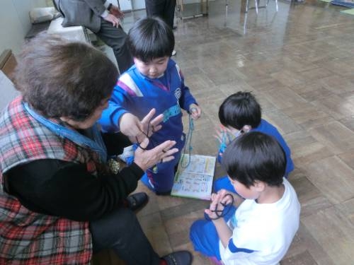 遊びタイムの前半では、コマ回しやめんこ、紙飛行機、おはじきで楽しみました。後半は、西日登かるたや自由あそび(お手玉、だるま落とし、ヨーヨーなど)で楽しい時間を過ごすことができました。