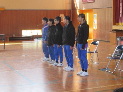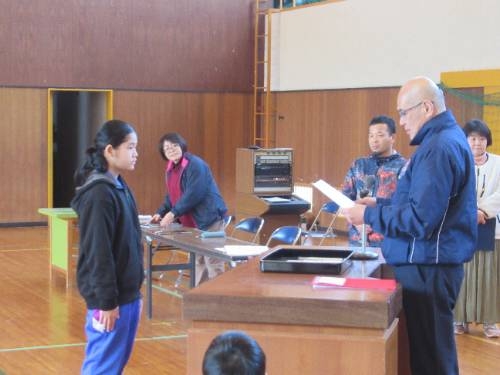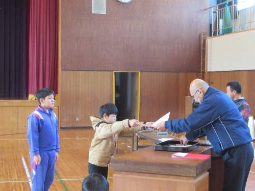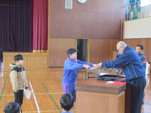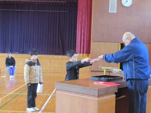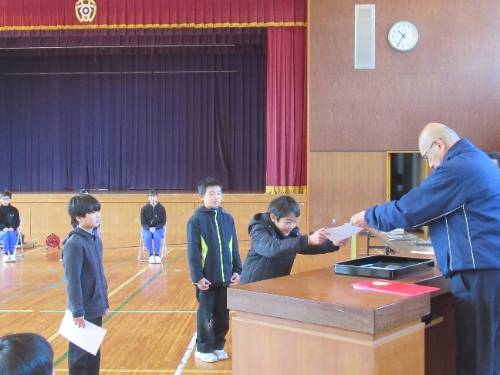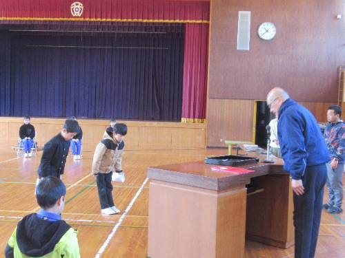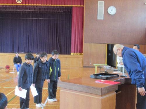式練習の後には、表彰式を行いました。書初めで頑張った人へと