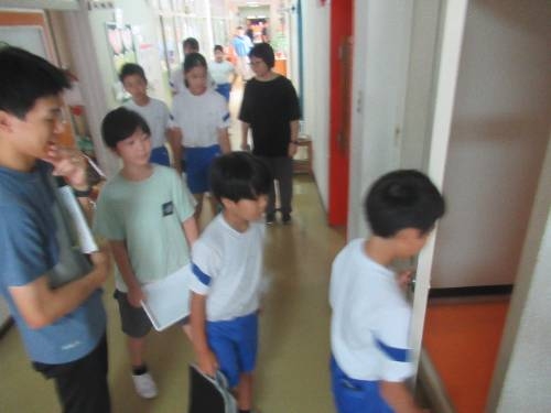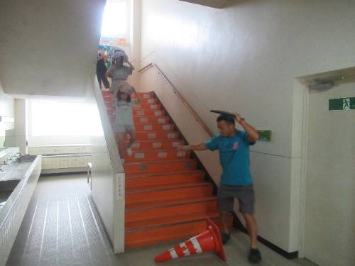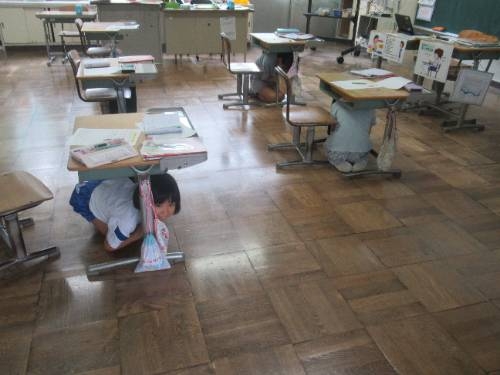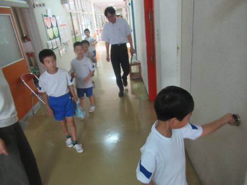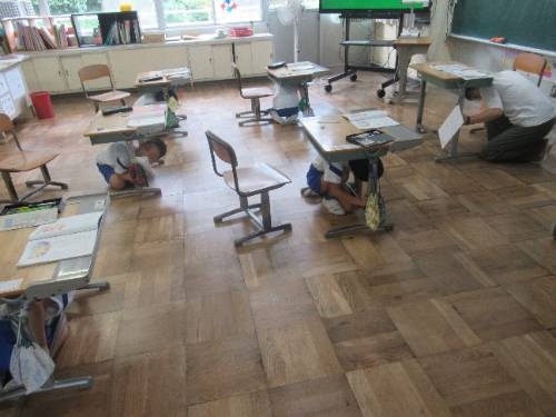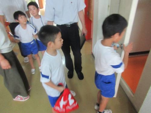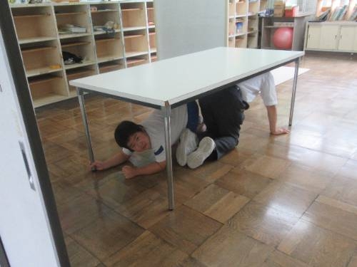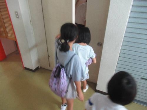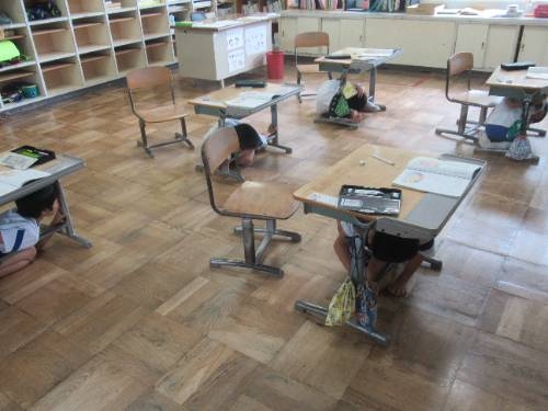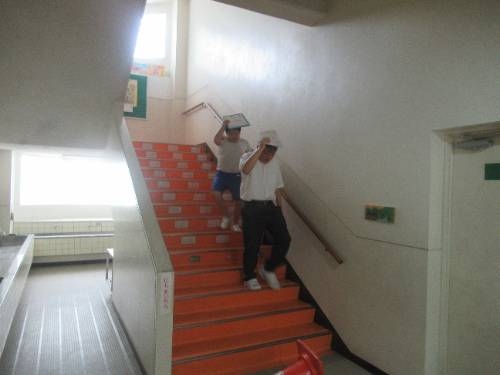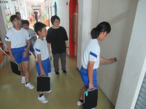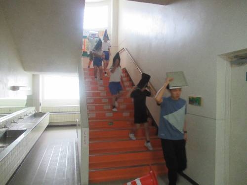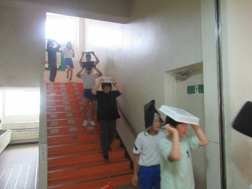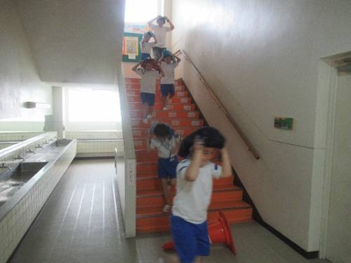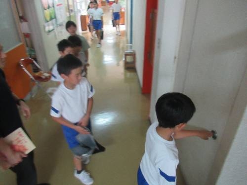 地震を想定した避難訓練を行いました 9/25地震を想定した避難訓練を行いました。大きく揺れるため、まず自分自身の身体を守る行動をとります。そして、避難経路が確認された段階で避難を開始します。子どもたちは、各自、上から物が落下した時に備えて、頭を守りながら、静かに行動することができました。とても立派な態度で訓練に取り組んだ子どもたちでした。 訓練後、万が一防火扉が作動していた時のために、どのような構造になっているのかを確かめながら、教室へ上がっていました。