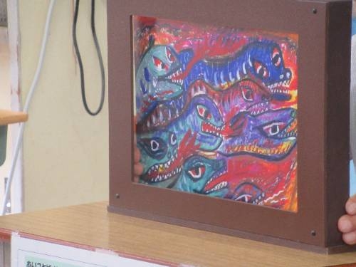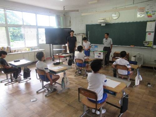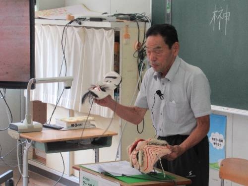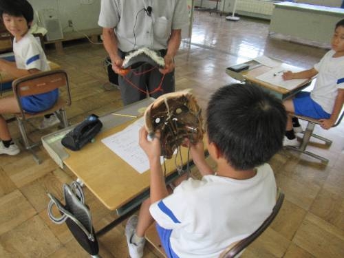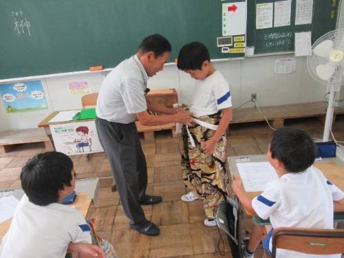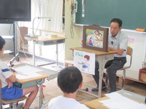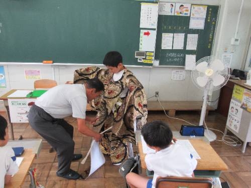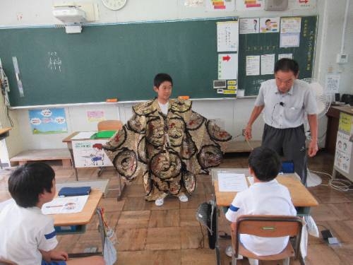 ヤマタノオロチ伝説学習 3,4年生が、地域講師をお招きし、ヤマタノオロチ伝説の学習を行いました。西日登神楽社中代表の高尾様にお越しいただき、西日登で盛んにおこなわれている神楽の由来やその様子についてお話していただきました。西日登はヤマタノオロチ伝説の発祥の地でもあり、子どもたちは、用意していただいた紙芝居やお話にくぎ付けになっていました。神楽で使う衣装やお面を実際に手に取ることができた子どもたちは、大喜びでした。