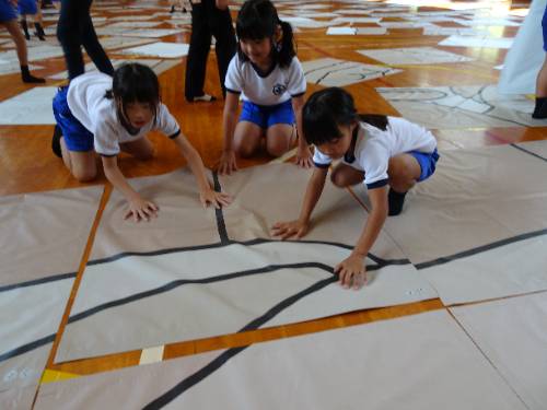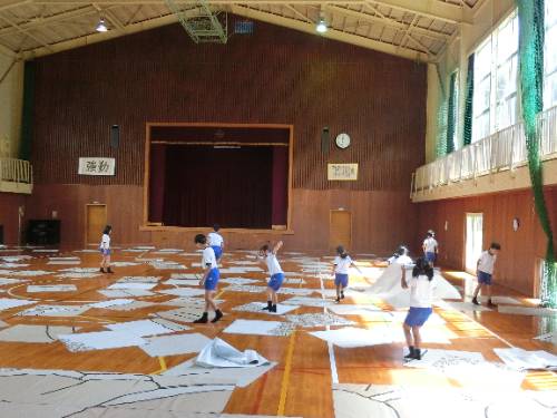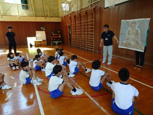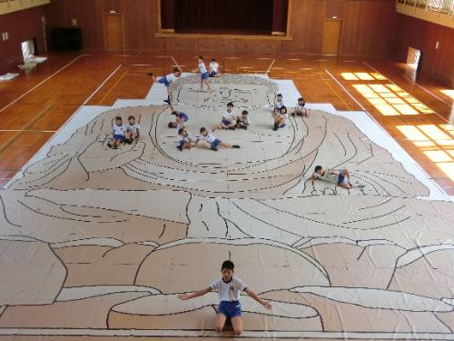 後半の授業では、体育館に会場を移し、実物大の大仏パネルづくりに全校で取り組みました。
