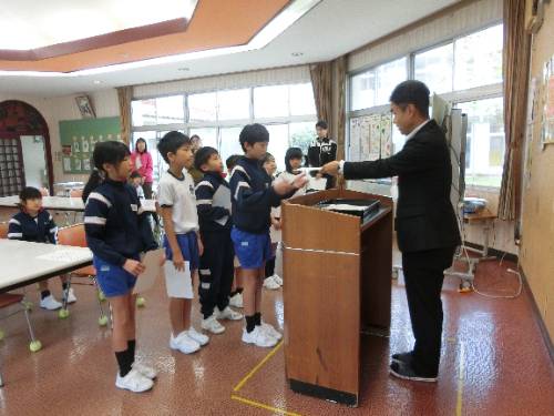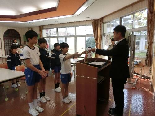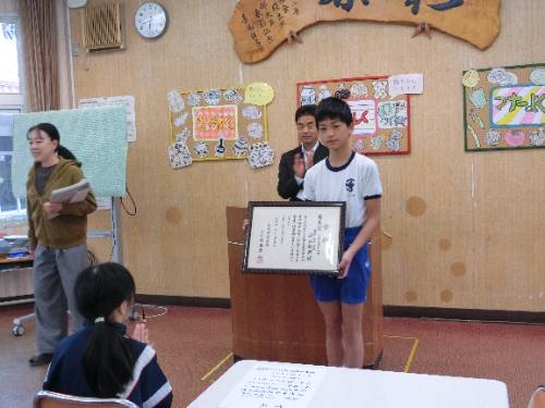 田井小の子どもたちが挑戦・努力したことについて、表彰を行いました。