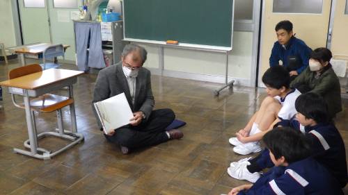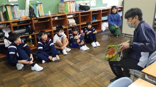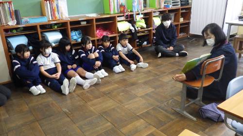 地域の読み語りボランティアの方がその学年の子どもに合う本を選び、読んでくださいます。(校長と教頭もメンバー参加。)
