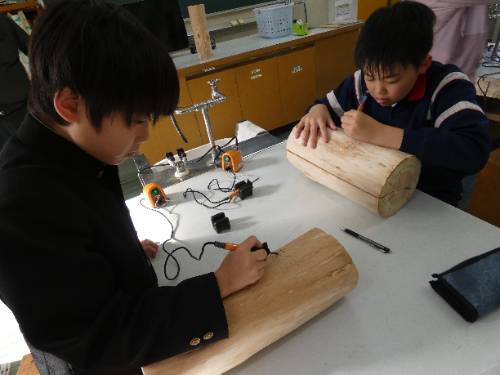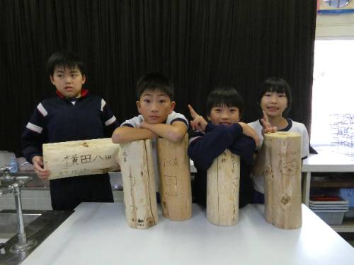 丸太椅子作り体験 2025年12月23日 06:08 3・4年生が総合的な学習の時間に外部講師の方から丸太椅子作り体験をさせてもらいました。 自分で考えた字や絵を焼入れ、オリジナルの丸太椅子が完成しました。