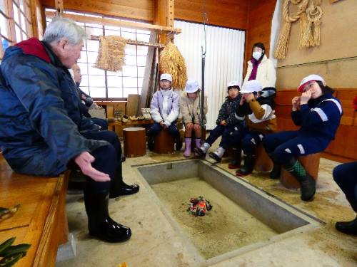 1・2年生が曽木地区にでかけ、いろり体験の学習をしました。