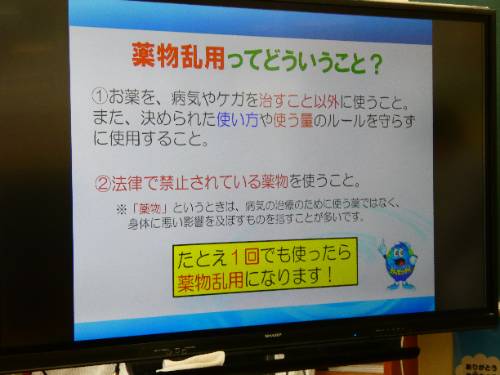 特別に、薬剤師の先生にお越しいただき、薬物乱用の危険性や中毒性、対処の仕方等について、専門的かつ具体的に教えてもらいました。