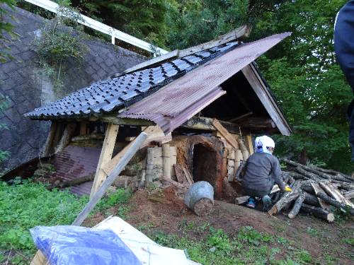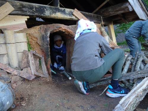 名人の皆さんは、熟練の技で「木を詰め込む工程」や、最後に「レンガと粘土で入り口にかまどを作る工程」を、お見事としか言いようのない知識と経験、技術で仕上げてくださいました。