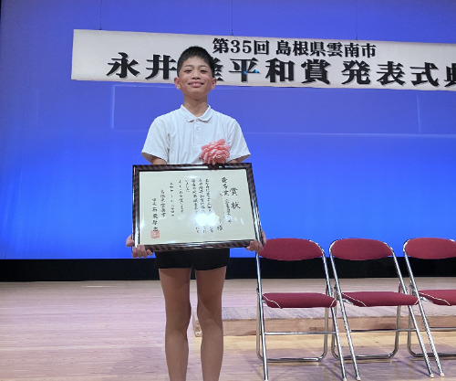本校児童が出品していた平和作文が、全国から応募された371もの作品のうちから、何と「優秀賞(第2席)」に選ばれました!