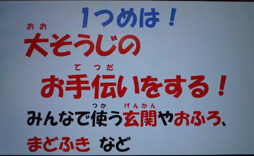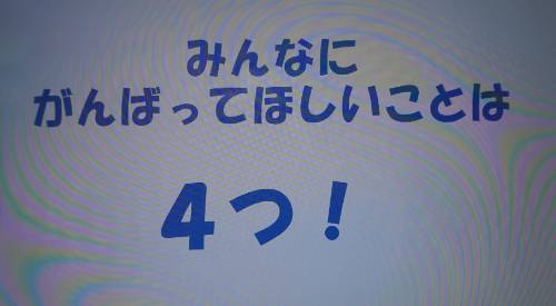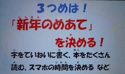 最初に私の方から、新しくなった校舎での2学期を振り返った後、「冬休みにがんばってほしいこと(4つ)」をパワーポイントを使って話しました。