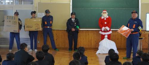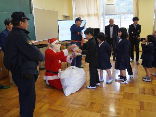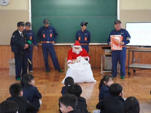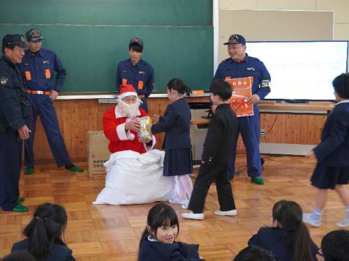 消防団の方からは、火の用心について。駐在所の山﨑さんからは、交通事故と不審者に気をつけることについて。そして、サンタさんからは「お菓子の詰め合わせ(1,000円相当分)」を一人ひとり手渡しでいただきました。子どもたちにとっては、おうちでもらったサンタさんからのプレゼントに続いて2つ目のプレゼントでニコニコ顔でもらっていました(このお菓子は、地域のある匿名の方からだそうでお名前はおっしゃいませんでした(^^;))。