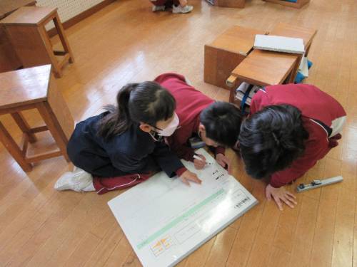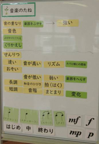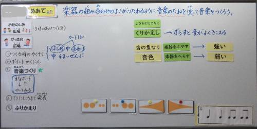 【楽器の組み合わせのよさが伝わるように、音楽のたねを使って音楽をつくろう】というめあてで、グループごとに「音楽のたね(くりかえし・よびかけとこたえ・音の重なり・同じリズムをかさねる等)」を意識しながら音楽づくりに取り組んでいました。