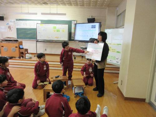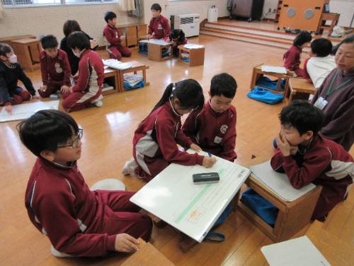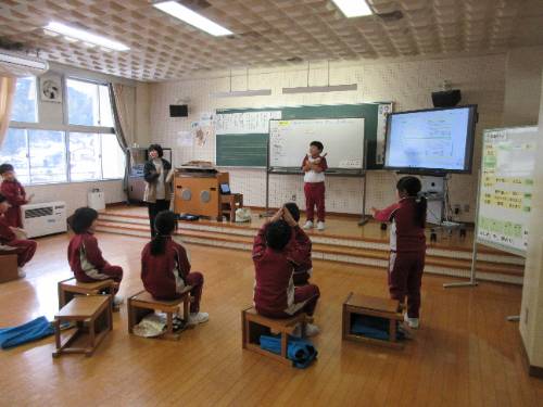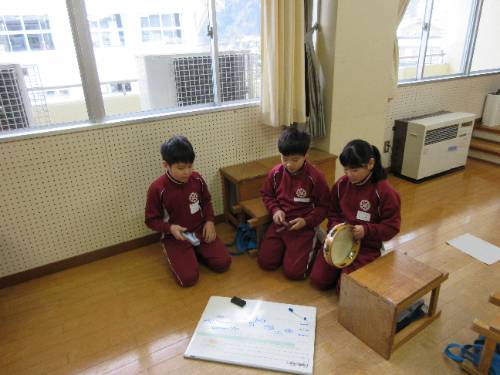 3・4年生が音楽の授業をしていました。「いろいろな音のひびきに親しもう」という題材の『音楽づくり』の授業で、全5時間中の4時間目の授業でした。