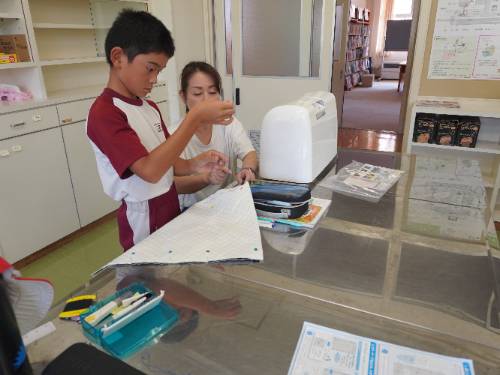 6年生、愛育学級に続いて5年生もナップザック作りに取りかかりました。
