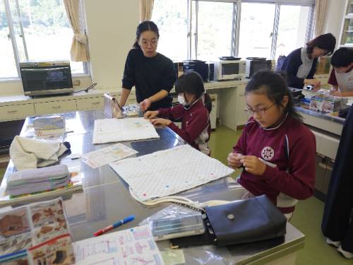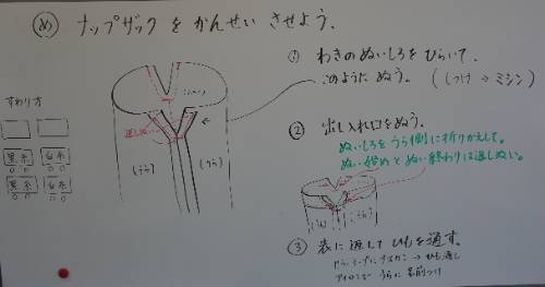 中には、ミシンに入る前の仮止めで苦労している子もいましたが、修学旅行で使う自前のナップザックを一生懸命作成していました。