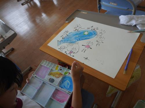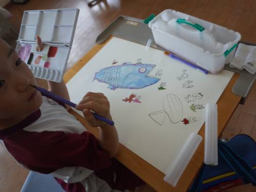 まだ創作の途中ですが、大きな魚と小さな自分たちを比較した絵になっていました。