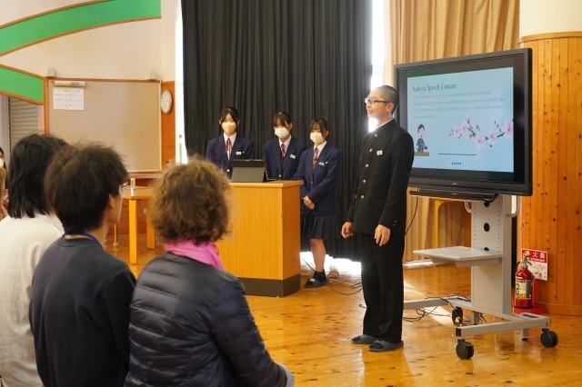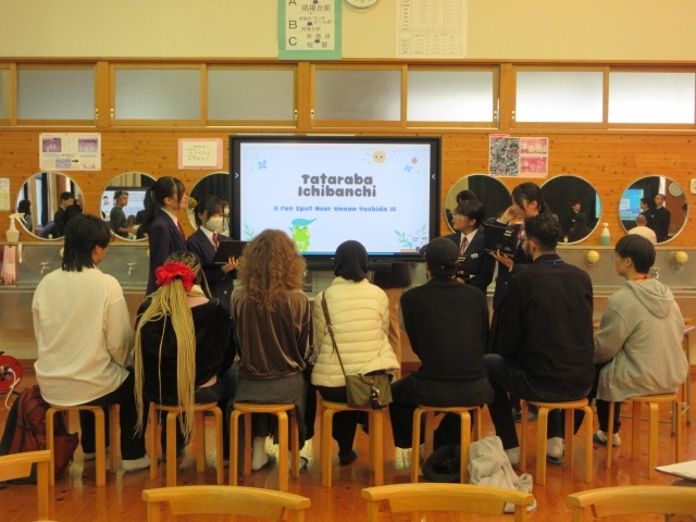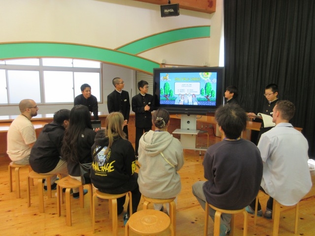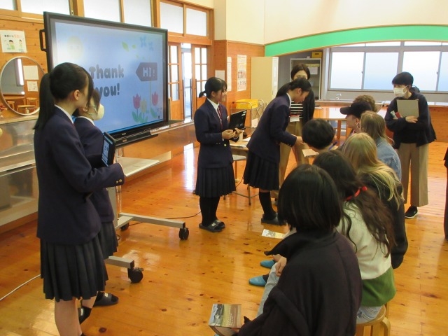まずは全校英語の取組に参加してもらい、3つのグループに分かれて各学年の取組を発表しました。