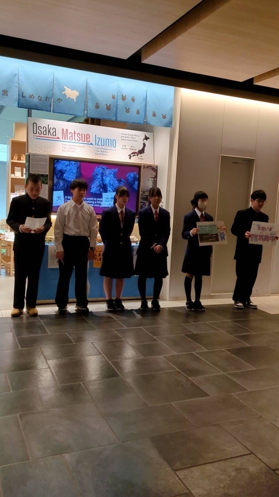2年修学旅行団は、大阪KITTE内「しめなわや」さんにて地域の特産品等を紹介・販売する「魅力発信活動」を始めました。