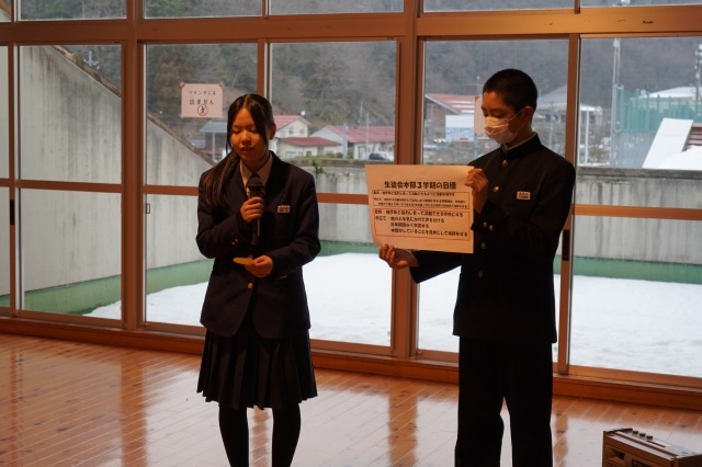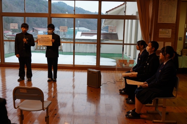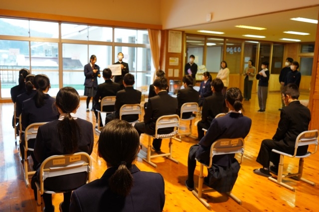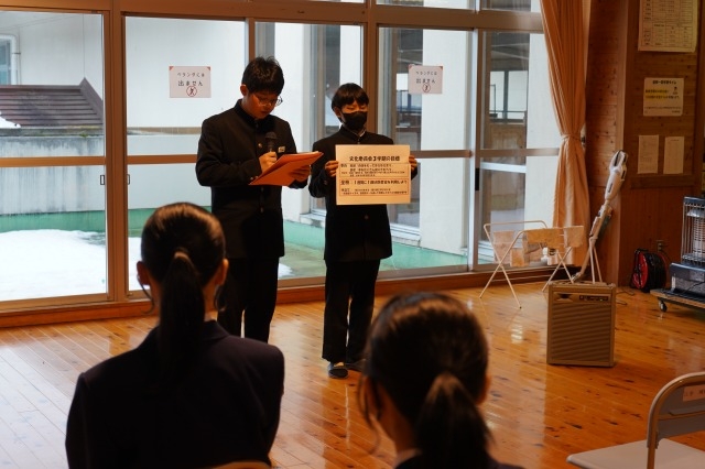 先日行った各委員会で、話し合った内容等を受け、全校に共有するための生徒会朝礼を行いました。