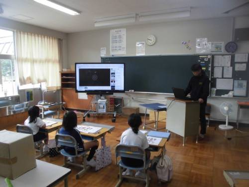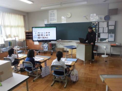 10月15日(水)、2年生は生活科の学習で「ままたまご」の山本さんにおいでいただき、吉田のおいしいものについてお話をしていただきました。地元の食材を使っていろいろなおいしいものを作っていることを映像を交えながら教えていただきました。子どもたちは、「いつも食べているよ。」「それ知ってるよ。」と反応しながらよく聞いていました。