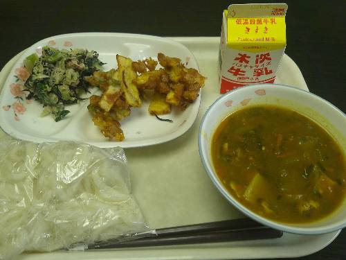 「厚揚げの五目スープ」は、たくさんのミニ絹厚揚げに玉ねぎ、しいたけ、ごぼう、ニンジンなど具だくさんな中華スープでした。生姜も入っていて温まりました(^^♪