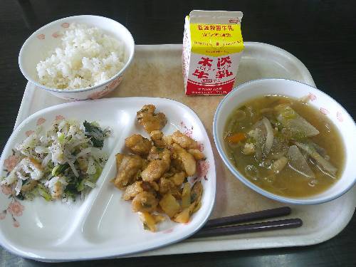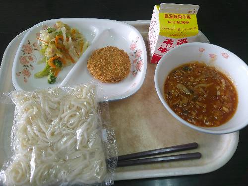 今日は月一回の「麺の日」で、「スパゲティミートソース」でした。豚ミンチの他、玉ねぎ、にんじん、インゲン、しめじ、大豆など具だくさんでした。トマトの酸味が効いたスパでした(^_-)-☆